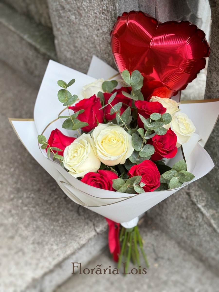 13 trandafiri,eucalipt,balon inima